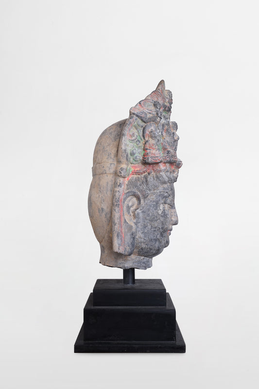 Buddhist sculptures from the Northern Qi period (6th century) further expand the collection, including votive steles and meditative bodhisattva heads—objects that embody a transcendent stillness and the spread of Mahayana Buddhism through visual form. Later pieces, such as fire-gilded bronze figures of Tara and Avalokiteshvara from the Qing dynasty, illustrate the ritual sophistication and cross-cultural resonance of Buddhist art in China.