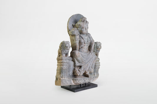 Gandharan figure of Panchika sitting on throne, flanked by two lions – India, 2nd–3rd century