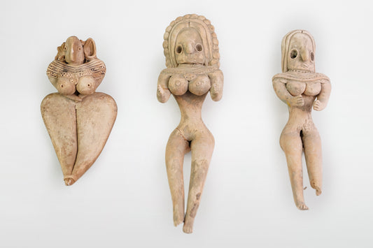 The collection also includes terracotta figurines from the Indus Valley civilization (circa 2000 BCE), embodying fertility motifs and early symbolic forms. Though abstract and minimal, these pieces offer insight into proto-iconographic practices in ancient South Asia.