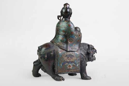 Luohan reitet auf einem Löwen, Bronze-Cloisonné – China, 18. Jahrhundert