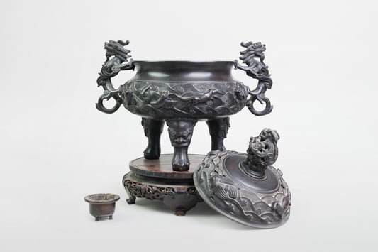 Prächtiges Räuchergefäß aus Bronze mit Holzsockel – China, 18. Jahrhundert
