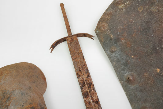 Gladiator equipment: iron pauldron, sword and shield – Rome, 2nd/3rd century