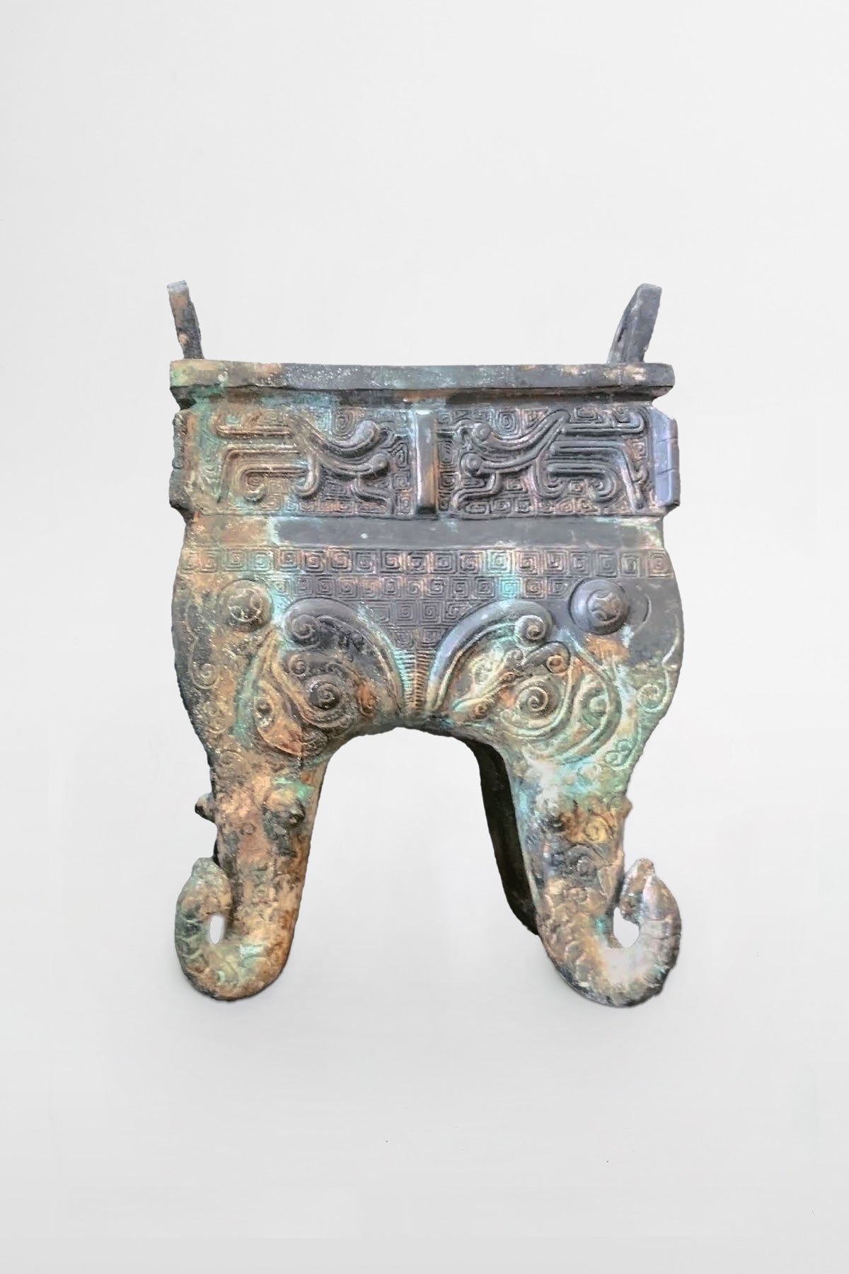 Mit Füßen in Form von Elefantenköpfen und Elefantenrüsseln und Oberflächenmuster in Form des Yunwen-Wolkenmusters (Spirallinien). Unterhalb der Gefäßöffnung ein Band mit Phönix-Dekor. Die zoomorphen Verzierungen wurden durch starke Vereinfachung zu abstrakten Mustern. Das Taotie (Zentrum der Gefäßwände) war zu Beginn der Zhou-Zeit die primäre Dekoration.
