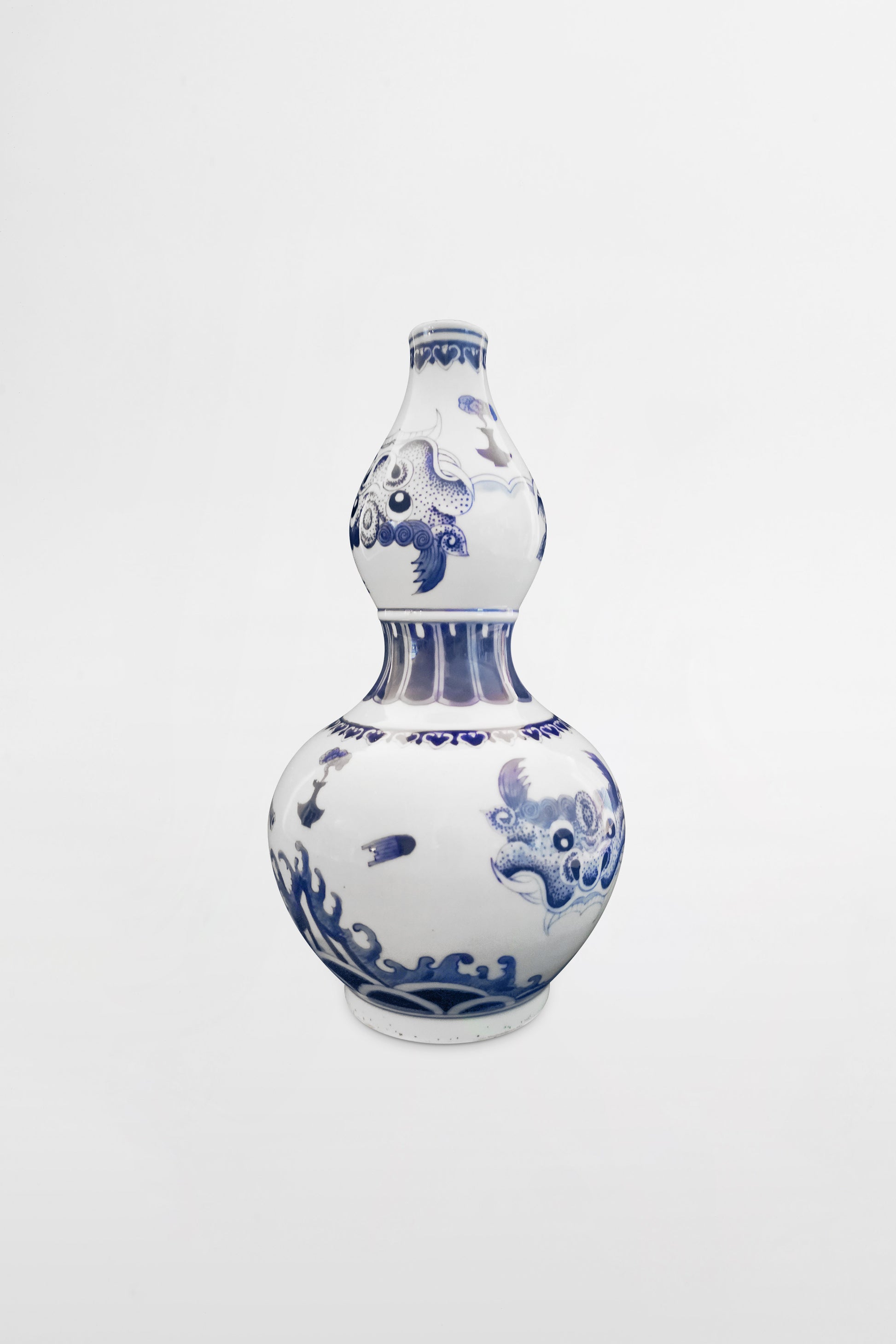 Auf dem oberen Gefäßkörper finden sich ebenfalls zwei Tao-lieh-Masken. Hier sind sie allerdings kopfüber dargestellt, abwechselnd mit den kleinen, Rauch ausstoßenden Zauberfläschchen. Die Tao-lieh auf den beiden Kalebassenkörpern sind in nahezu gleicher Größe auf unterschiedlich großen Flächen dargestellt. Dadurch entstehen interessante und spannende Kontraste zwischen Blau und Weiß, Ober- und Unterseite. Porzellan, Unterglasur Kobalt, transparente Glasur.