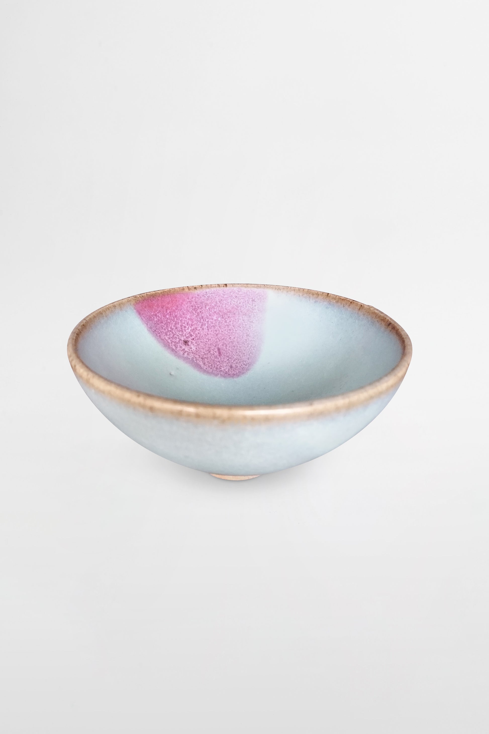 Kleine Schale aus Steinzeug. Die tiefe Schale hat eine glatte Jun-Glasur mit transluzentem Rand (mi-huang). Ein Wasserzeichen befindet sich exzentrisch am Rand der Schale.