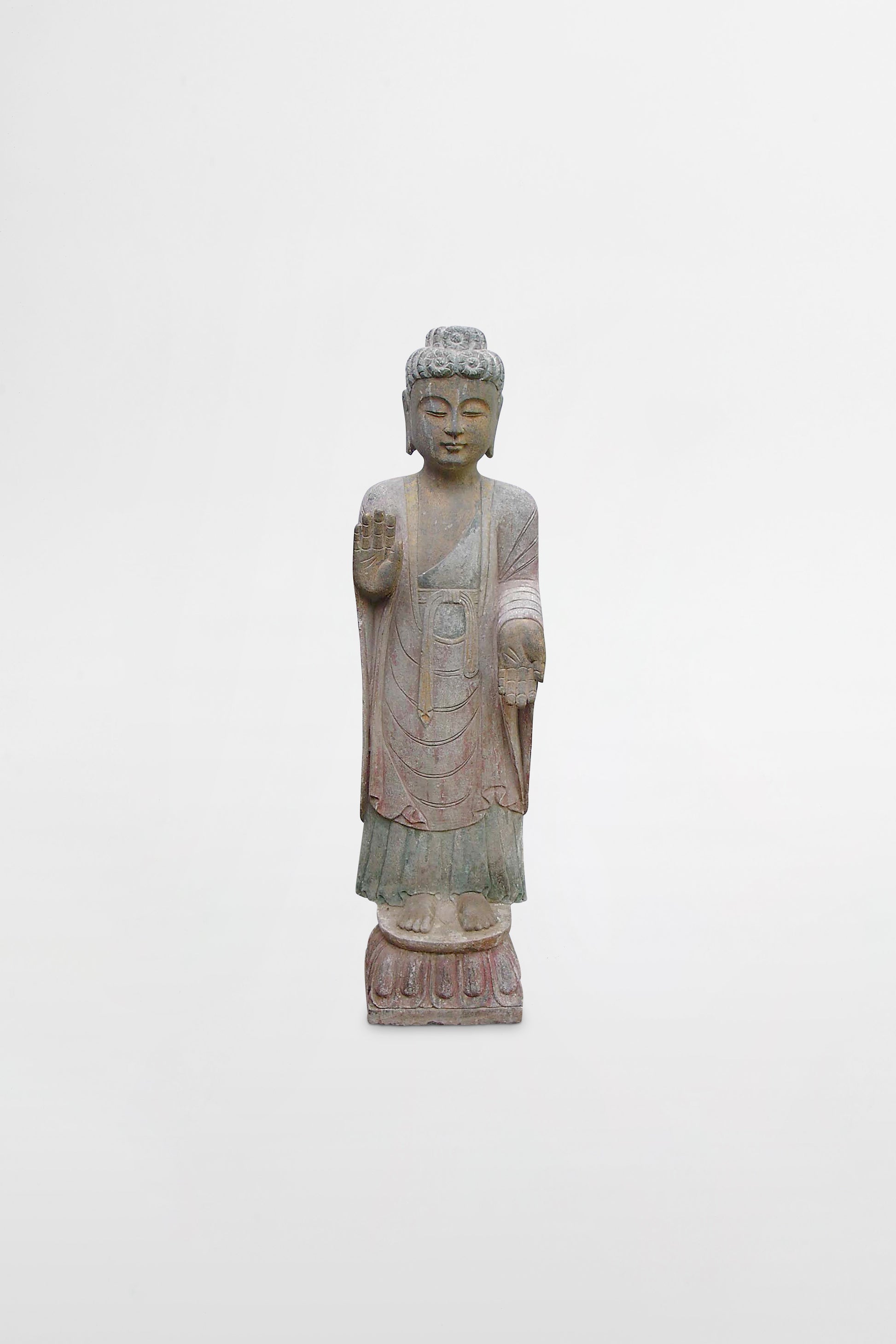 North Qj. style, abhaya/varada mudra Remains of painting and gilding are preserved. Column style.