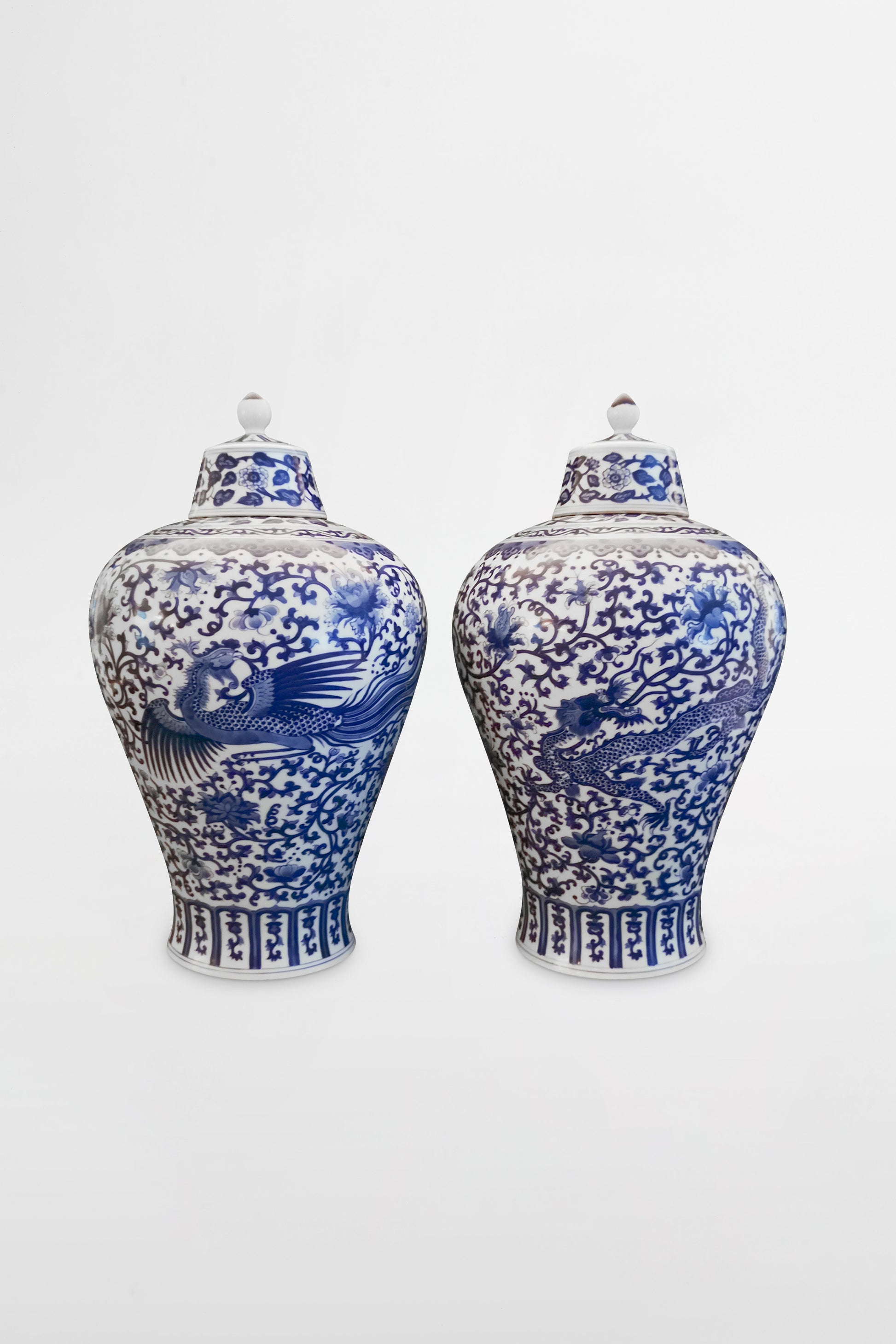 Die Vasen tragen außen fein abgestufte blau-weiße Dekore. Sie zeigen jeweils einen (fünfklauigen) Drachen (Symbol des Kaisers) und einen Phönix (Symbol der Kaiserin), die sich zwischen Blattranken und Malvenblüten unterschiedlicher Größe präzise nach links bewegen. Eingerahmt werden diese Hauptmotive von Blattkränzen aus aufrecht stehenden (Lotus-)Blütenblättern an den Vasenfüßen und – von den Vasenschultern aufwärts – einer Abfolge von Kranzfriesen aus Ruji (Wolkenornamenten), Mäanderranken und einer Blattranke mit vier Malvenblüten. Kurze, aufrechte Bananenblätter umschließen den Vasenhals.