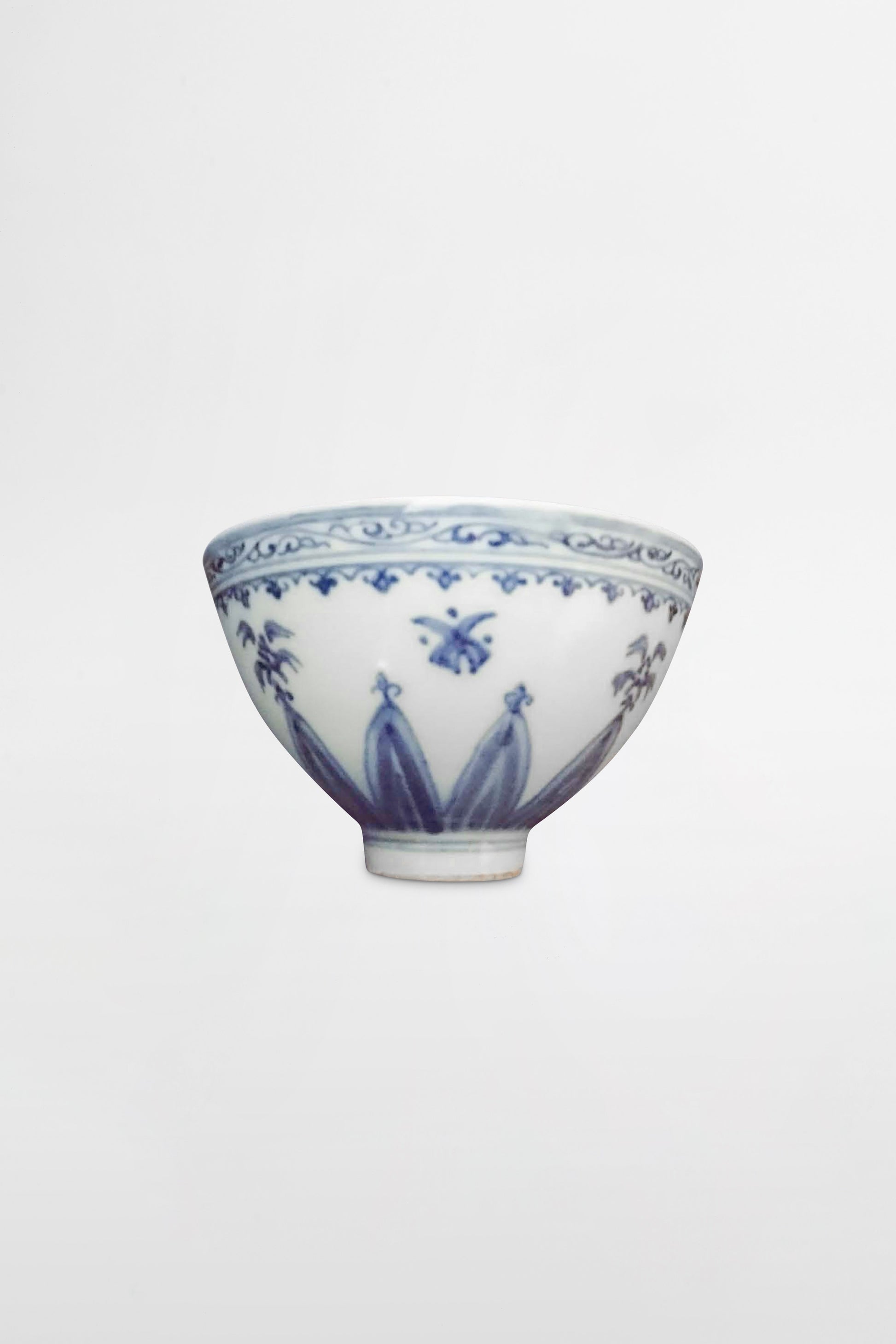 Kleine blau-weiße Schale. Fein geformt in Form einer Lotusblüte. Unterglasur Kobaltblau auf Porzellan.