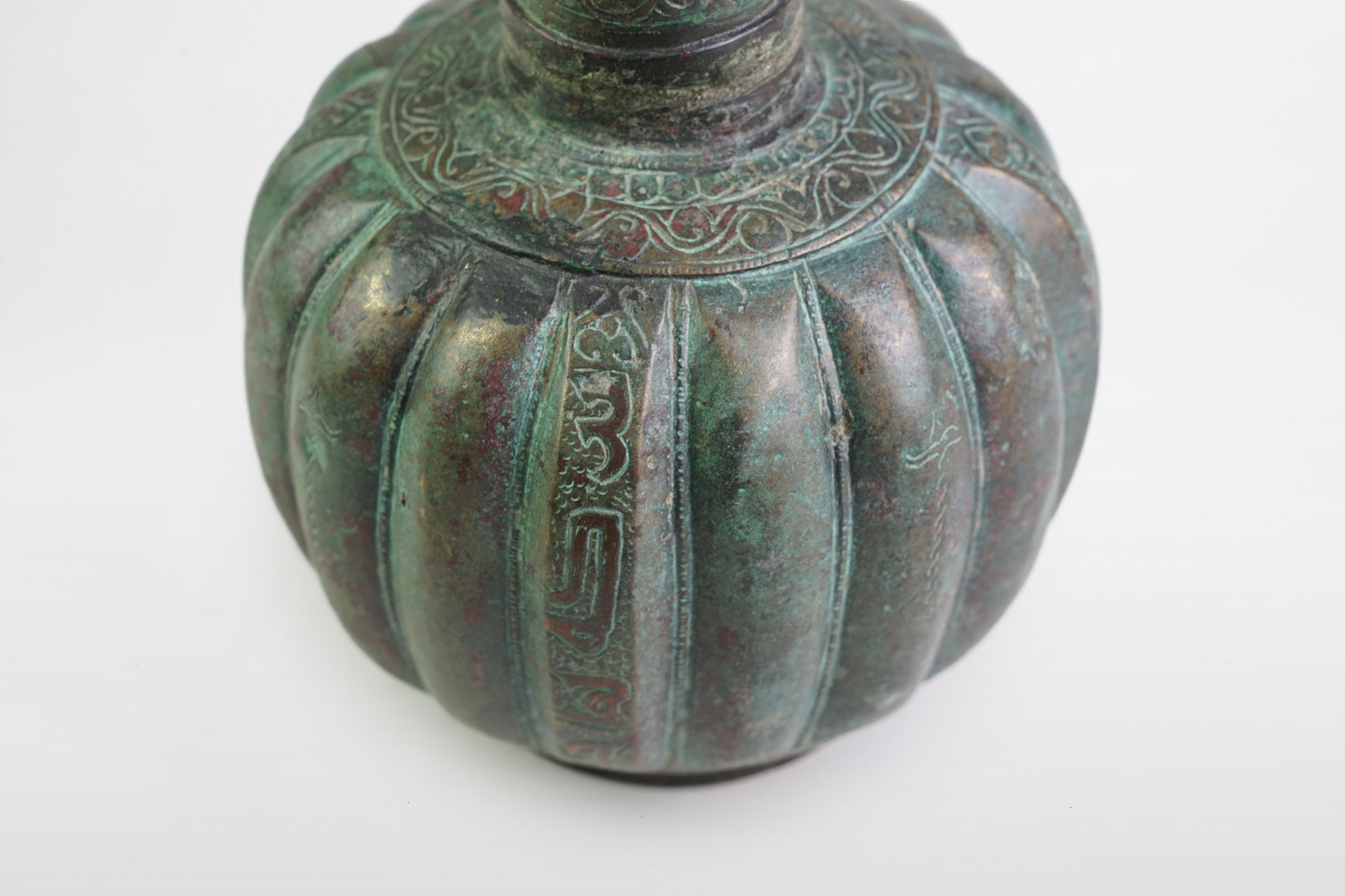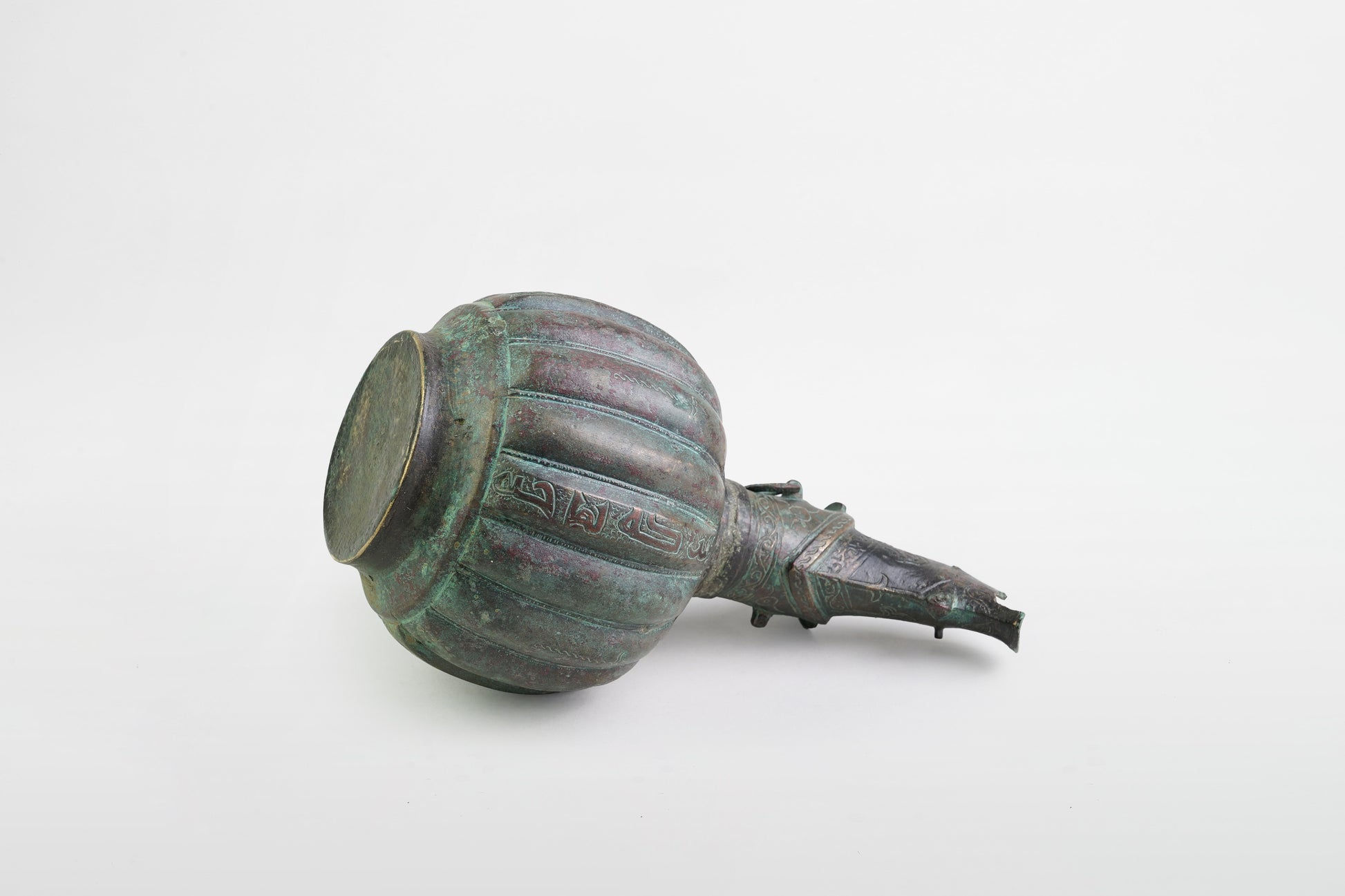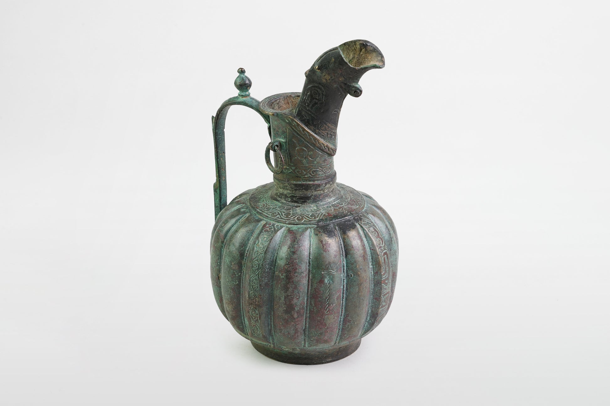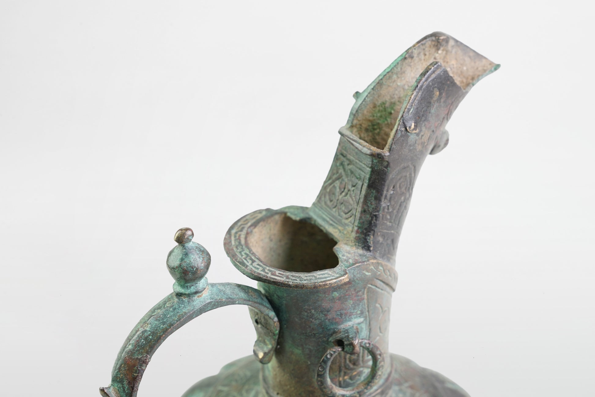 Seldschukische, dunkel patinierte Bronzekaraffe mit Gravuren – Nordostpersien, 12. Jahrhundert