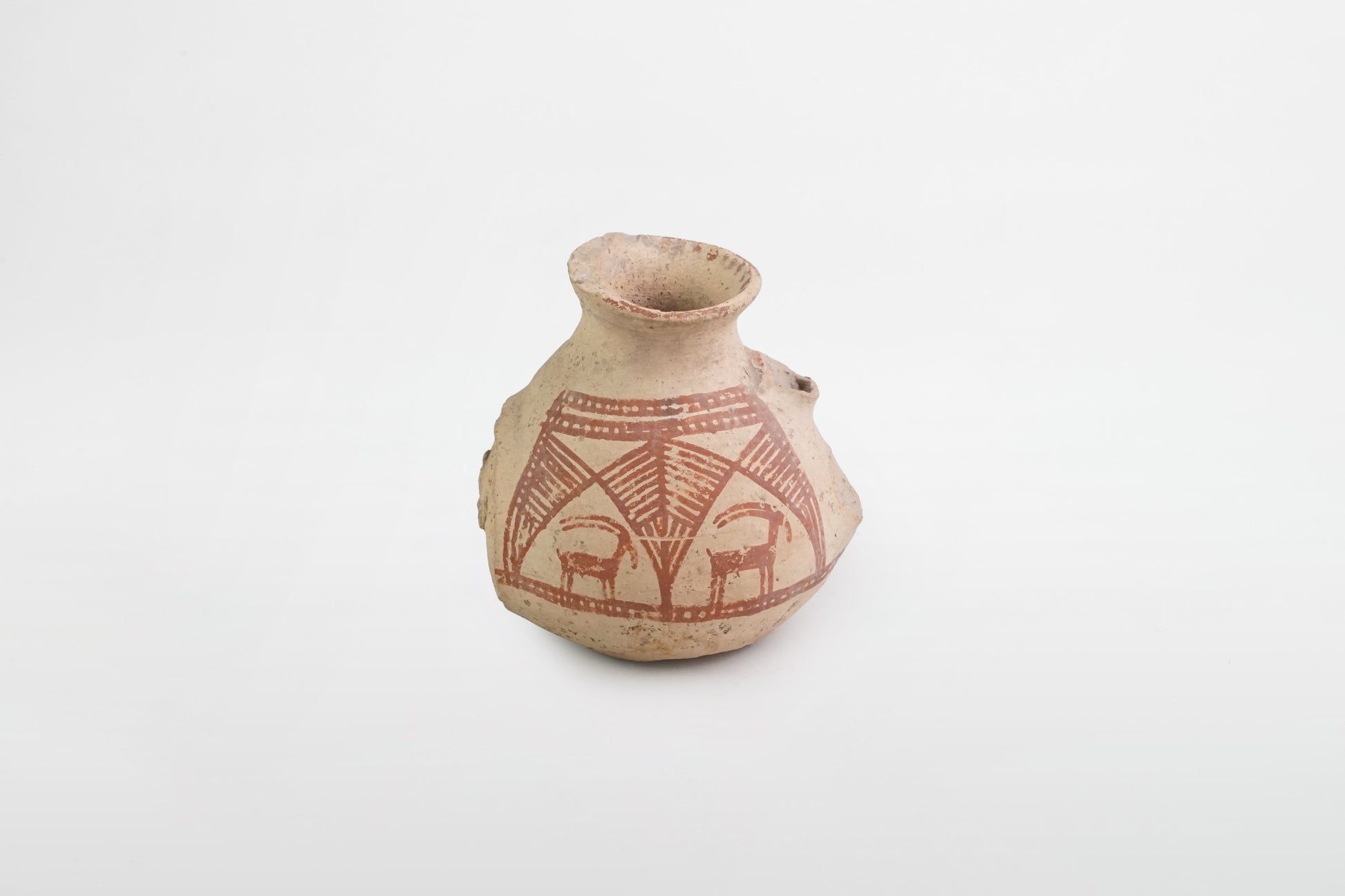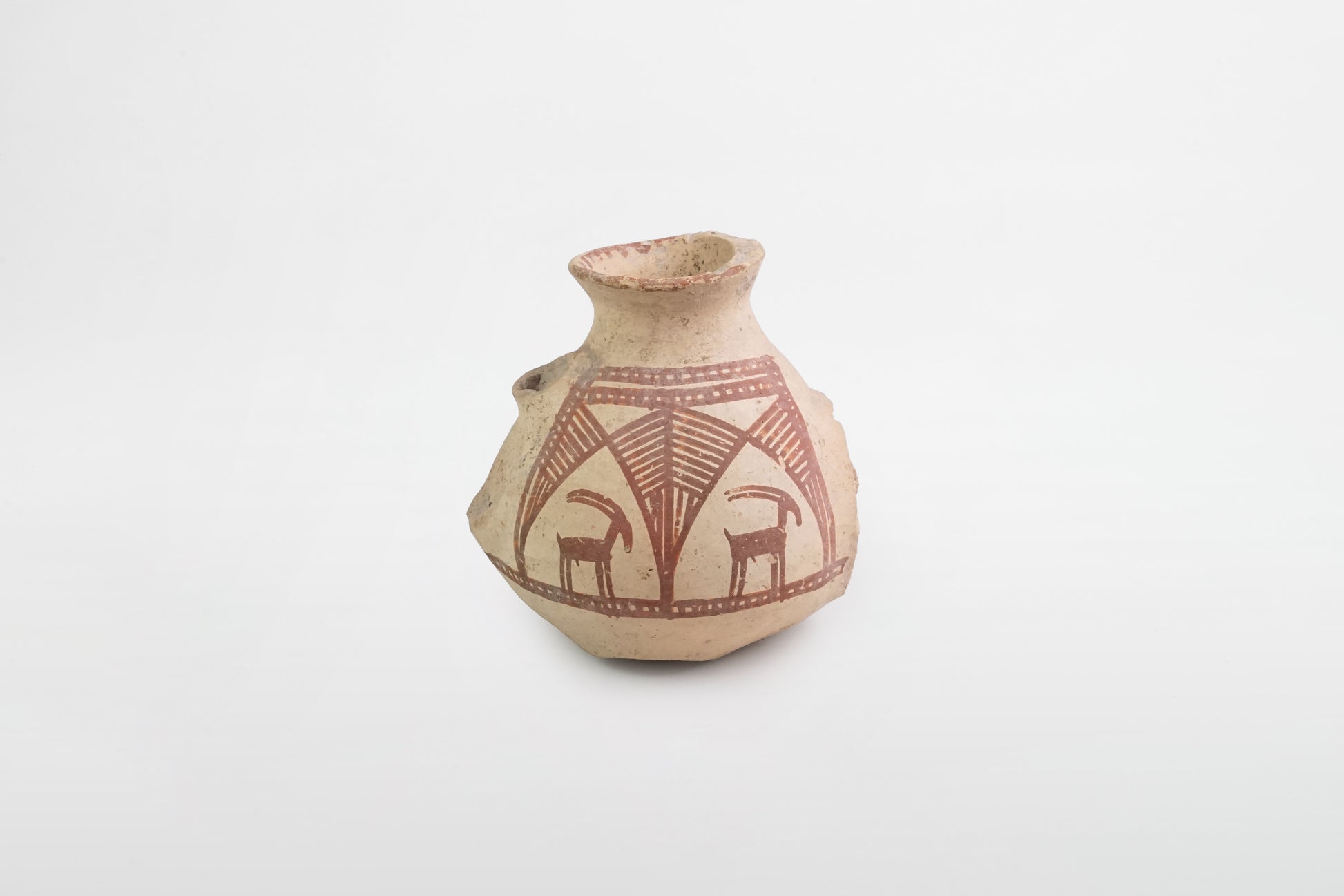 Sehr gut erhaltene rotbraune Darstellung zweier stilisierter Wildziegen. Henkel und Ausgießer fehlen.