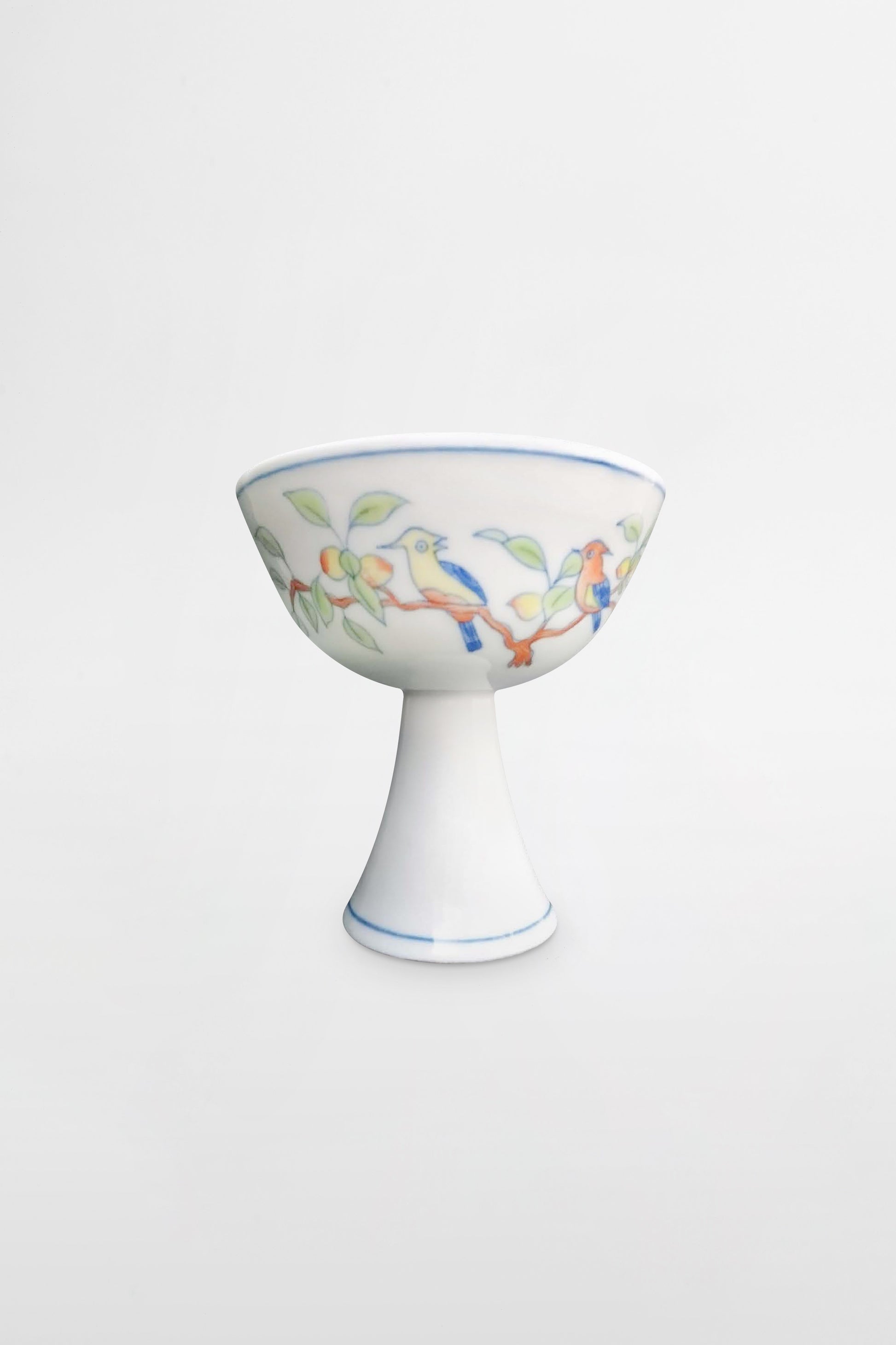 Diese kleine Fußschale aus Porzellan ist sehr fein gearbeitet. Die Außenseite ist in Unterglasur-Kobaltblau und Emaille bemalt und zeigt zwei Vogelpaare, die auf Obstzweigen sitzen.
