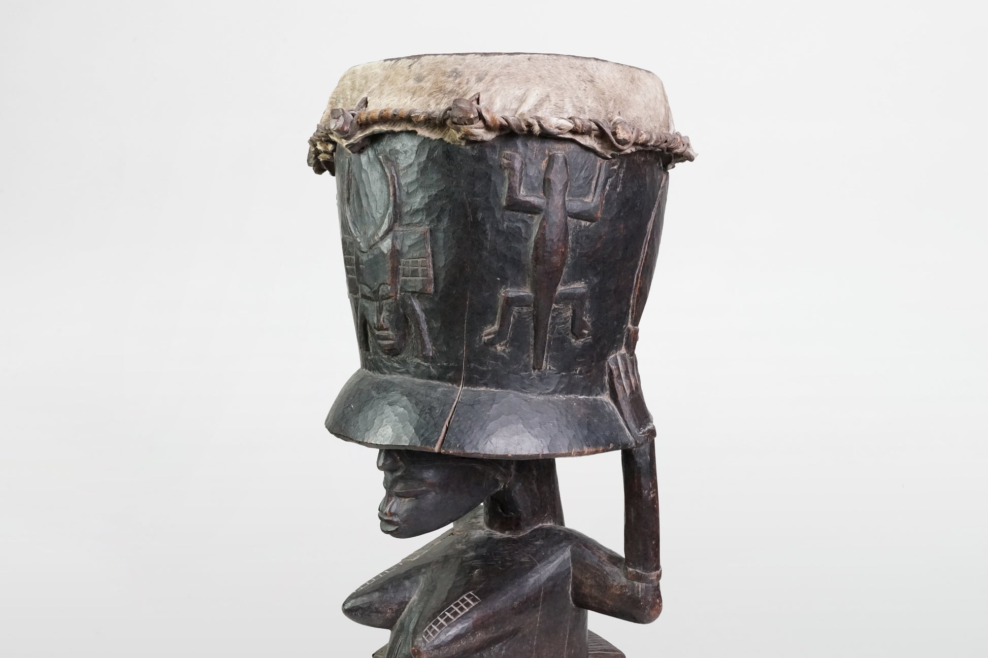 Hölzerne Karyatidentrommel mit weiblicher Trägerfigur, Yoroba – Nigeria, 20. Jahrhundert