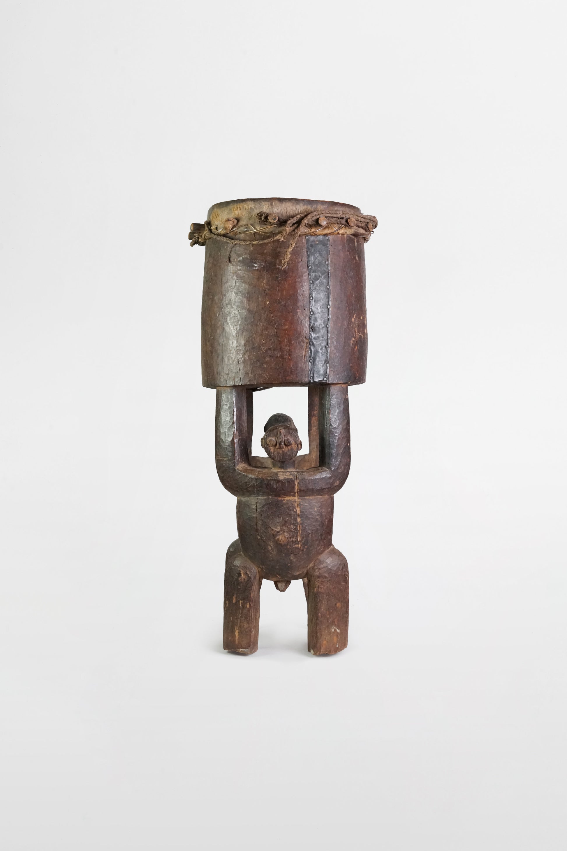 Hölzerne Trommel (Karyatide), gehalten von einer männlichen und einer weiblichen Figur, Batcham – Kamerun, 20. Jahrhundert