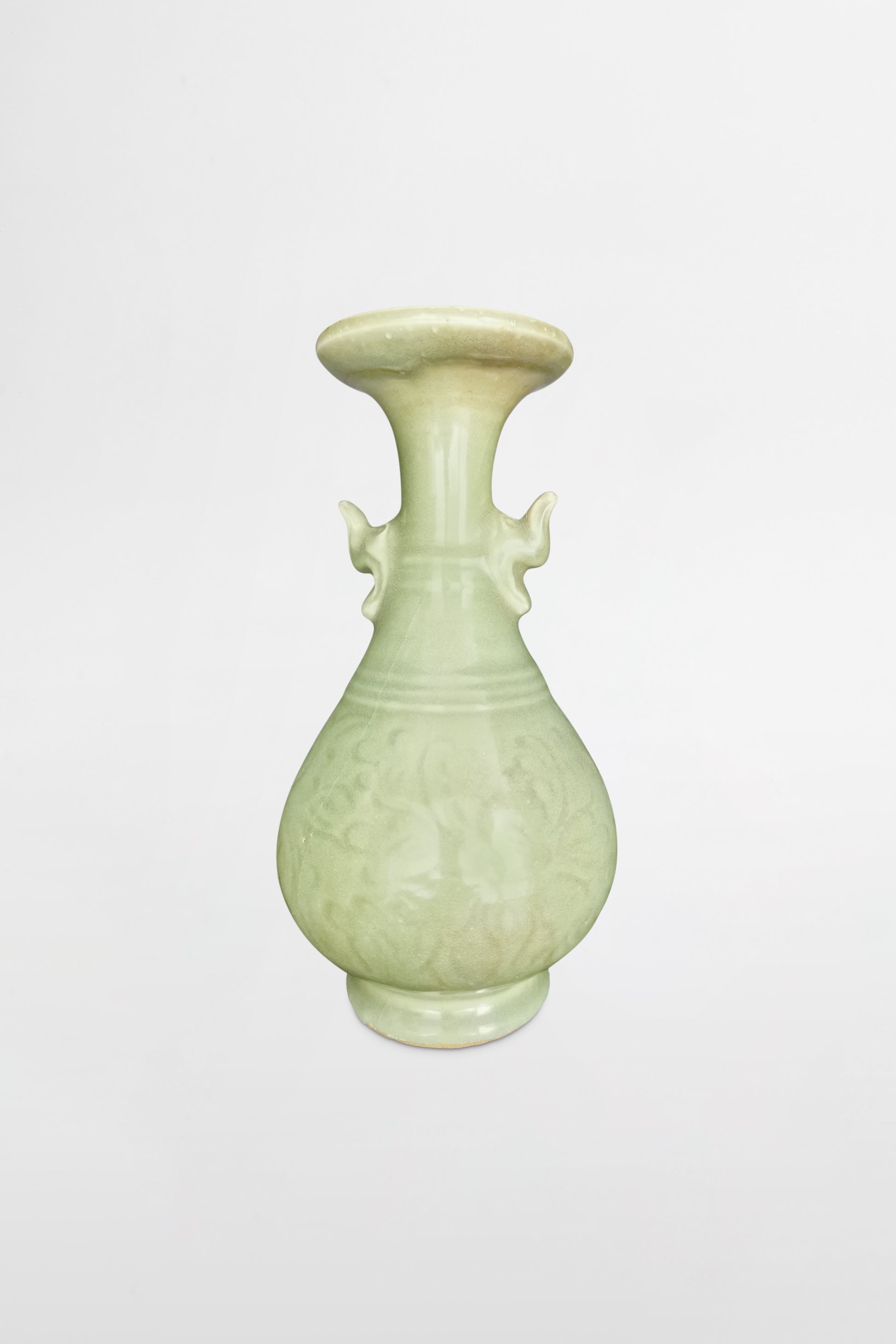 Steinzeug, hellbeiger Scherben, heller Engobe, transparente Glasur. Gedreht (mehrteilig), zusammengesetzt, geschnitten (Flachrelief), engobiert, glasiert, hochgebrannt. Vollständig engobiert/engmaschiges Cracquelé (Hals).
